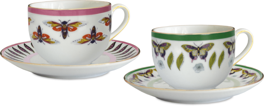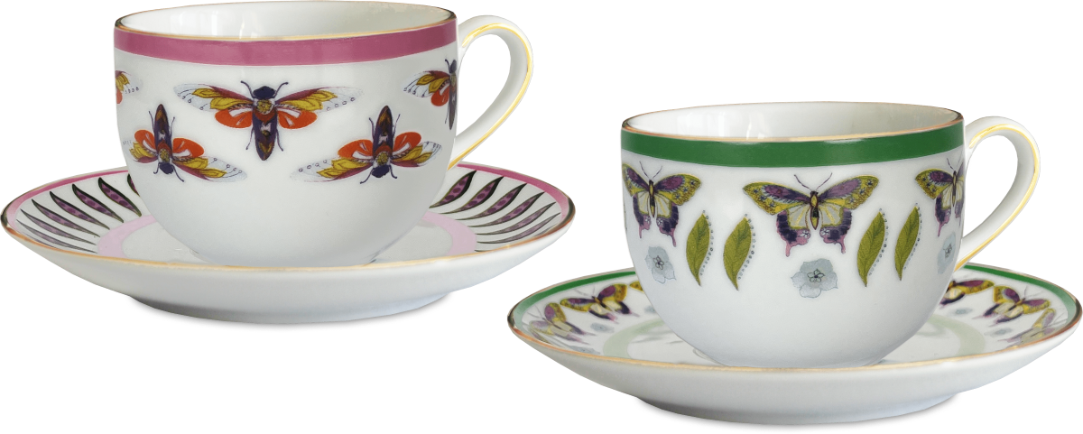 Descrição: Xícaras de chá em porcelana, cada uma acompanhada por pires, trazendo estampas diferentes e cheias de personalidade. Uma delas apresenta detalhes em rosa com borboletas vibrantes, enquanto a outra combina o verde com libélulas delicadas e flores. Um conjunto elegante que une sofisticação e beleza para a sua mesa.