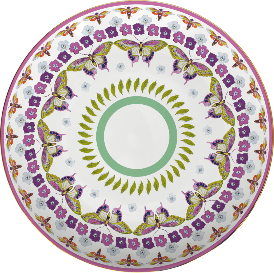 Descrição: Sousplat de porcelana decorado com um delicado conjunto de borboletas, flores e folhagens em tons de verde, rosa e roxo. Uma peça sofisticada que valoriza a composição da mesa posta, trazendo charme e elegância para ocasiões especiais.