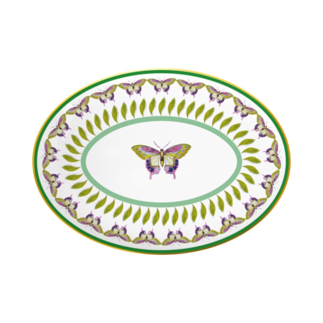 Descrição: Travessa oval em porcelana, com estampa central de borboleta em tons vibrantes e detalhes delicados de folhas e flores ao redor. Uma peça sofisticada que valoriza a mesa posta com charme e elegância.