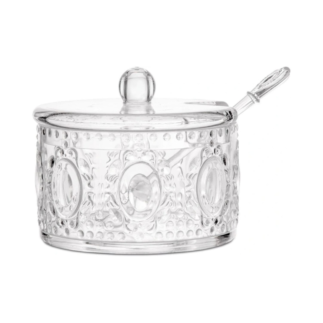 Descrição: Açucareiro com tampa e colher, feito em acrílico transparente com design em relevo estilo barroco, ideal para servir açúcar ou outros condimentos com charme e praticidade.