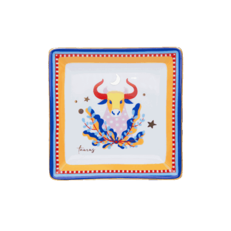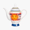 Descrição: Bule em porcelana decorado com cores vibrantes em branco, azul e vermelho. Destaca-se pelo sol amarelo e laranja na parte central, rodeado por padrões geométricos que reforçam o estilo alegre e marcante da peça.