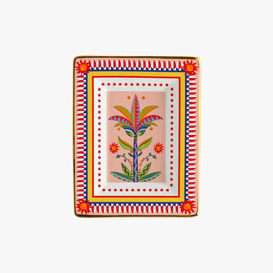 Descrição: Porta objetos em porcelana retangular, decorado com estampa central de árvore estilizada em cores vivas, borda colorida em vermelho, amarelo e azul e acabamento em friso dourado, que adiciona sofisticação e elegância à peça.