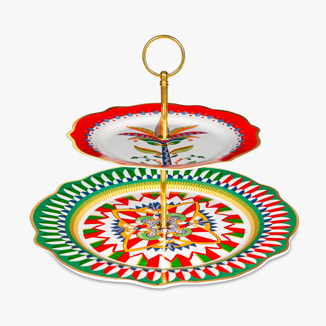 Descrição: Prato de dois andares em porcelana, com suporte em metal dourado. O prato superior traz fundo branco com detalhes vermelhos e o desenho de uma palmeira estilizada, enquanto o prato inferior exibe um grande sol central em meio a formas geométricas em verde, vermelho, azul e dourado. O acabamento em friso dourado realça a elegância da peça.
