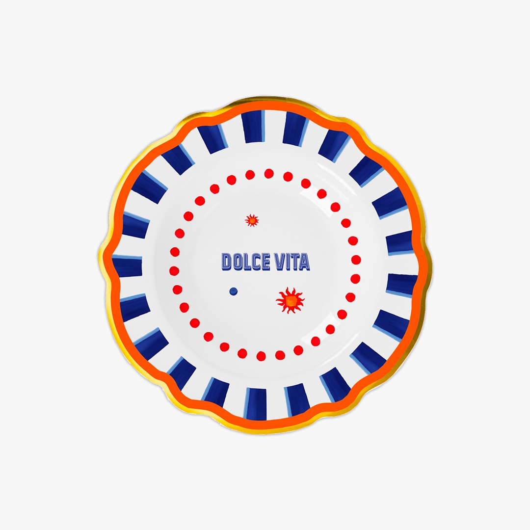 Descrição: Prato fundo em porcelana com a inscrição “Dolce Vita” no centro, trazendo uma mensagem leve e cheia de charme. A peça possui borda ondulada com composição vibrante de cores, combinando azul, vermelho, amarelo e detalhes em branco, criando um visual alegre e sofisticado. Ideal para servir massas, sopas e risotos, além de compor mesas cheias de personalidade.