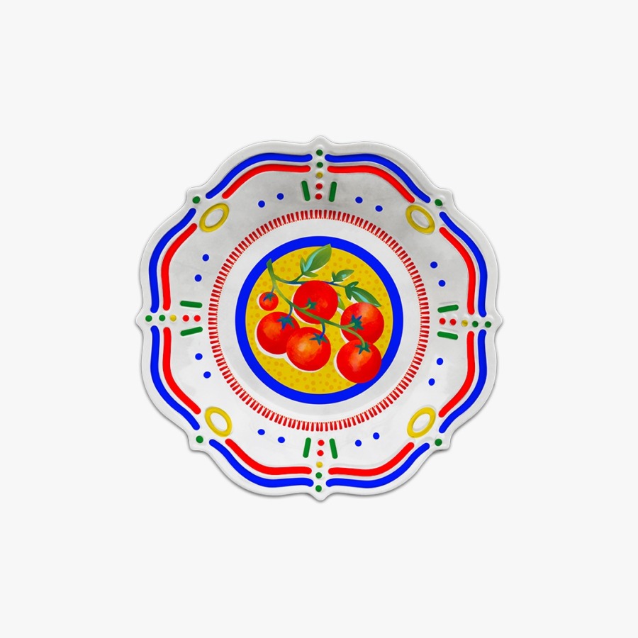 Descrição: Prato fundo em melamina decorado com estampa central de tomates em tons de vermelho e verde, sobre fundo amarelo. A borda apresenta arabescos e detalhes geométricos nas cores azul, vermelho e verde, criando um visual alegre e mediterrâneo.