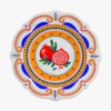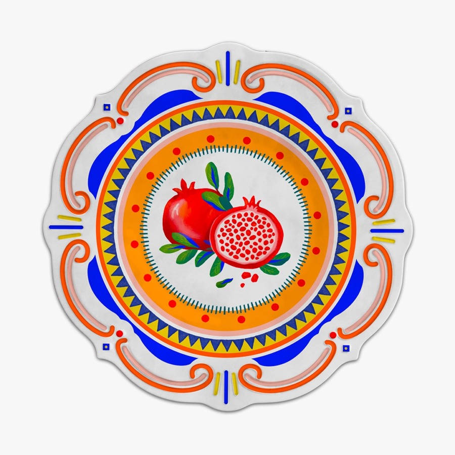 Descrição: Prato raso em melamina com estampa central de romãs vermelhas em contraste com folhas verdes. O contorno traz detalhes ornamentais em laranja, azul e amarelo, criando um visual vibrante e cheio de personalidade.