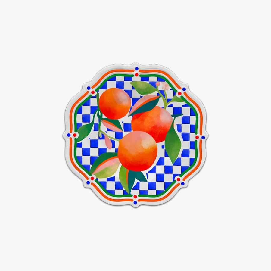 Descrição: Prato de sobremesa em melamina com estampa de laranjas em tons vibrantes de laranja e verde, sobre fundo xadrez azul e branco. A borda ondulada em vermelho, verde e amarelo complementa o design alegre e mediterrâneo.