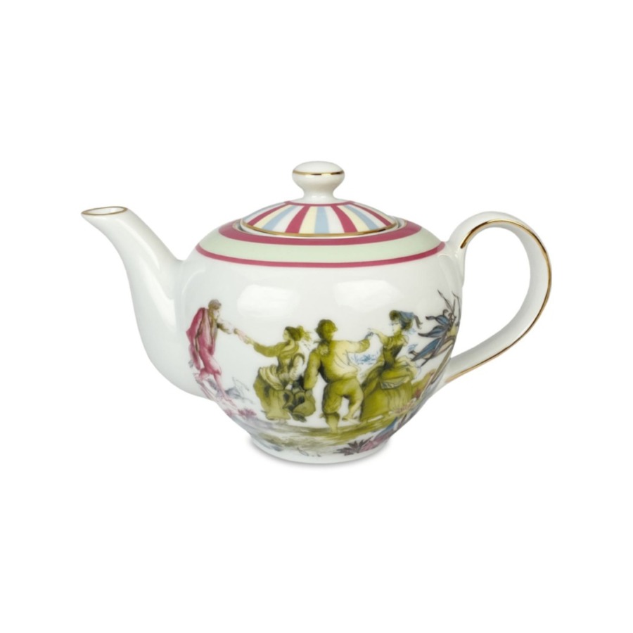 Descrição: Bule em porcelana fina com design clássico e sofisticado. Possui pintura artística com cena decorativa em tons de verde, rosa e dourado, além de tampa com listras em rosa e lilás. Os detalhes em dourado aparecem delicadamente no cabo, no bico e na borda da tampa, trazendo requinte e elegância à peça. Ideal para compor jogos de chá e café, unindo funcionalidade e beleza na mesa posta.