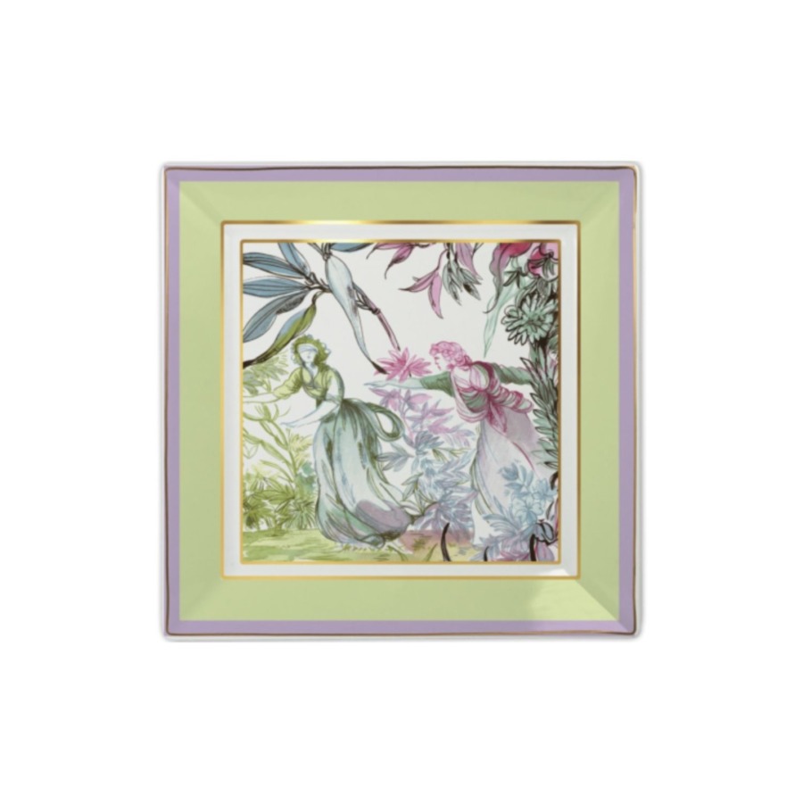 Descrição: Portaobjetos quadrado em porcelana, com bordas em tons de verde suave, lilás e detalhe em dourado que dão um toque sofisticado à peça. O interior traz estampa artística com flores e folhagens em tons de rosa, verde e lilás, criando um visual elegante e delicado.
