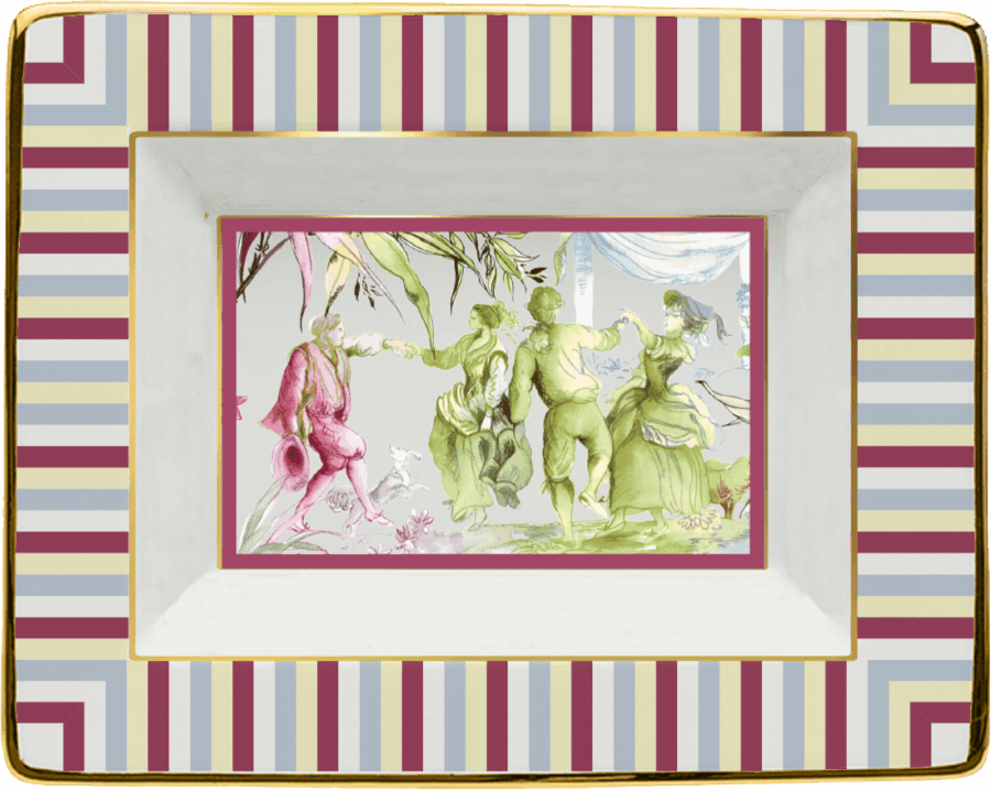 Descrição: Porta objetos retangular em porcelana, sofisticado e cheio de personalidade. As bordas apresentam listras em tons de lilás, azul, creme e vinho, com acabamento em dourado que valoriza ainda mais o design. No centro, a peça traz uma cena artística em tons de verde, rosa e bege, inspirada em ilustrações clássicas, tornando-o não apenas funcional, mas também decorativo.