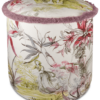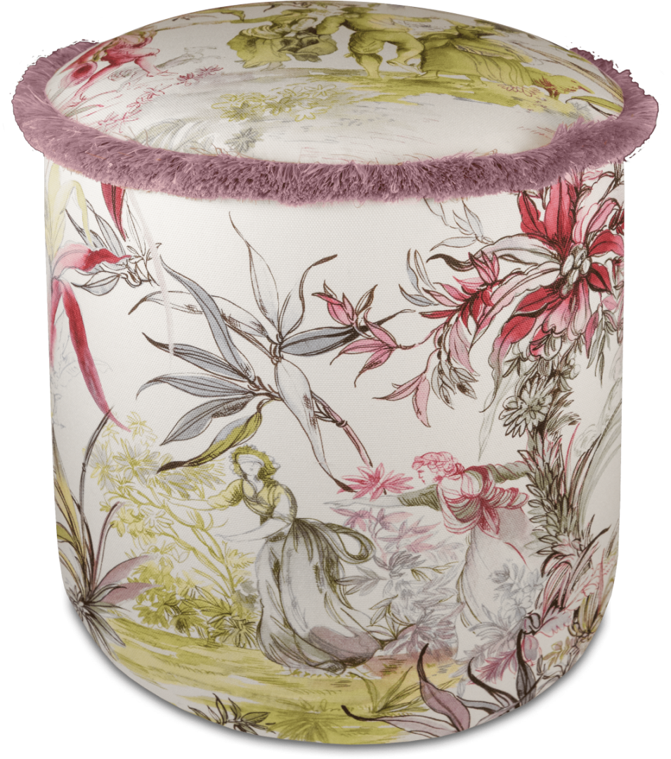 Descrição: Puff estofado em veludo com estampa artística de flores e folhagens em tons de rosa, verde e cinza sobre fundo claro. O detalhe em franjas na borda superior, em tom rosé, acrescenta charme e requinte à peça. Elegante e versátil, é ideal para compor salas, closets ou quartos, unindo funcionalidade, conforto e sofisticação à decoração.