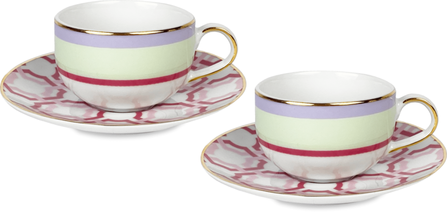 Descrição: Conjunto de xícaras de café em porcelana, com design sofisticado que combina xícaras em tons suaves de lilás e verde com pires estampados em padrão geométrico rosa, criando um contraste moderno e elegante. O acabamento em dourado na borda e na alça traz ainda mais requinte às peças, ideais para compor mesas postas sofisticadas e transformar o momento do café em uma experiência especial.
