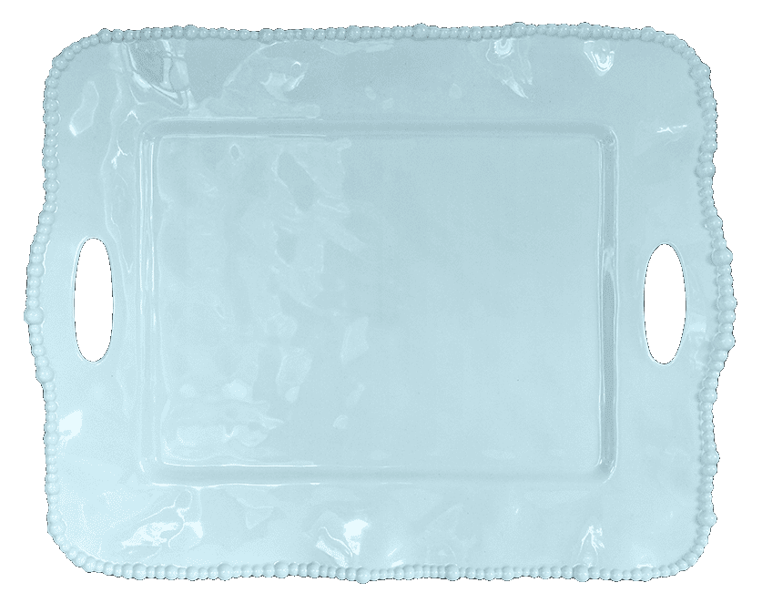 Descrição: Bandeja retangular em melamina na cor azul, com delicados relevos nas bordas e alças laterais que facilitam o manuseio. Sofisticada, é perfeita para servir com praticidade e elegância, além de compor mesas postas e recepções cheias de charme.