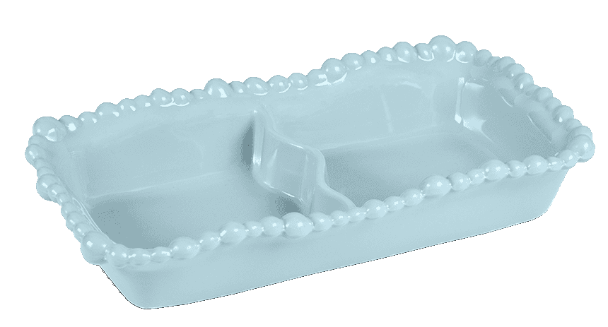 Descrição: Petisqueira retangular dupla pequena em melamina azul, com borda em relevo que valoriza o design. Possui divisórias práticas para servir diferentes tipos de petiscos ou acompanhamentos, unindo funcionalidade e elegância para compor mesas postas charmosas.