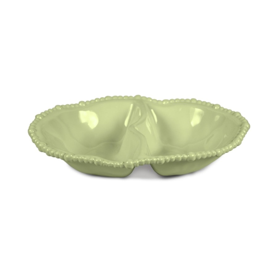 Descrição: Bowl duplo para aperitivos em melamina verde, com design delicado em borda em relevo. Funcional e sofisticado, permite servir diferentes opções de petiscos em uma única peça, unindo praticidade e elegância. Ideal para compor mesas postas e recepções cheias de charme.