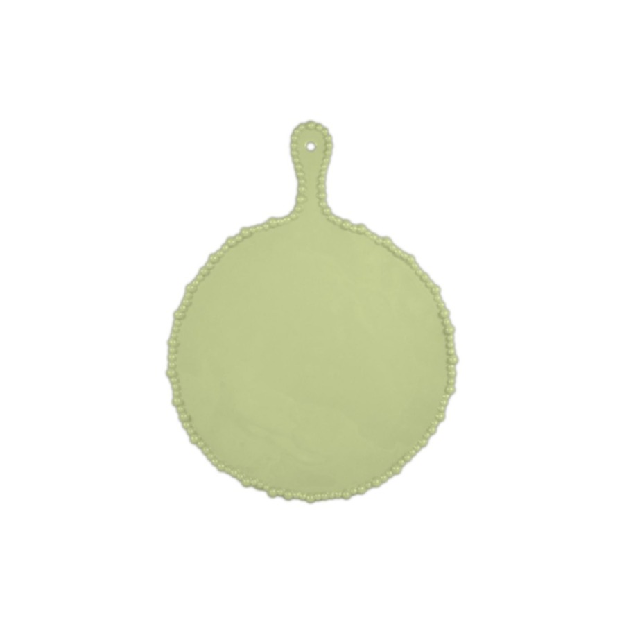 Descrição: Tábua grande em melamina verde, com formato redondo, alça para manuseio e borda em relevo que valoriza o design. Funcional e sofisticada, é ideal para servir frios, queijos, pães ou petiscos, acrescentando praticidade e elegância à mesa posta.