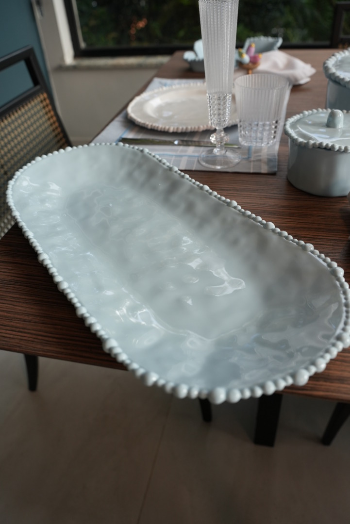 Descrição: Travessa oval em melamina azul, com design clássico e borda em relevo que acrescenta delicadeza à peça. Sofisticada e funcional, é ideal para servir assados, acompanhamentos ou saladas, valorizando a mesa posta com charme e elegância.