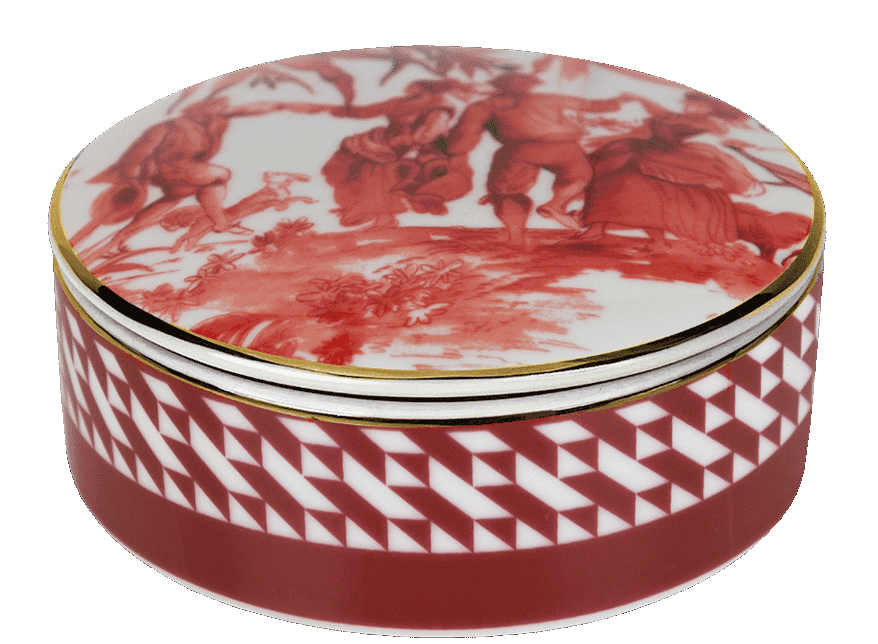Descrição: Porta joias em porcelana, com tampa estampada em vermelho artístico e base com padrão geométrico moderno na mesma cor. O acabamento em dourado na borda acrescenta requinte e sofisticação, transformando a peça em um item elegante e versátil. Ideal para guardar pequenos objetos ou compor a decoração com charme e estilo.