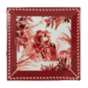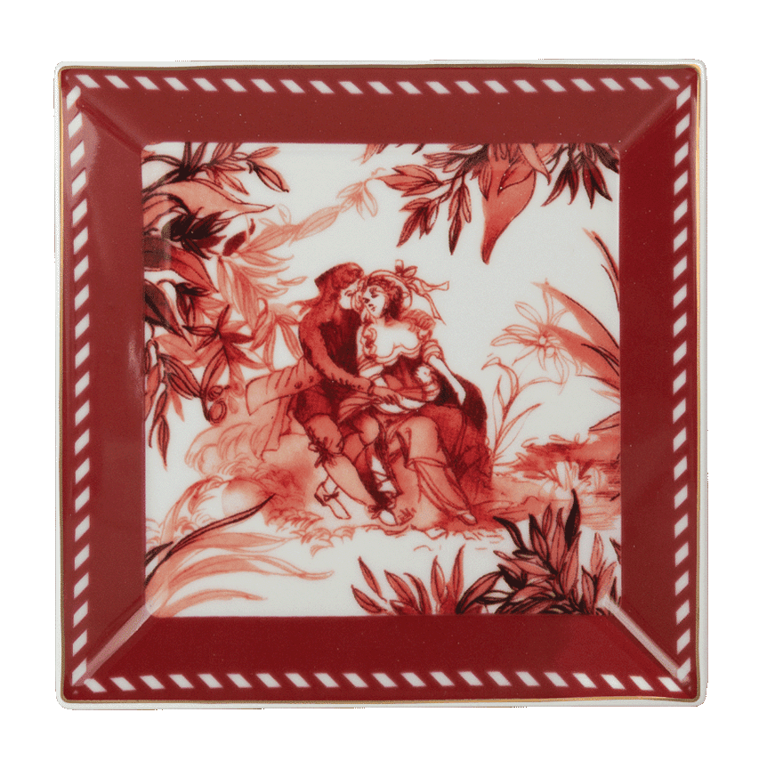 Descrição: Porta objetos quadrado em porcelana, com borda vermelha em destaque e detalhe geométrico delicado. No centro, a peça traz uma estampa artística em vermelho que retrata uma cena clássica entre folhagens, conferindo sofisticação e charme. Ideal para organizar pequenos itens ou como peça decorativa que valoriza a mesa e o ambiente.