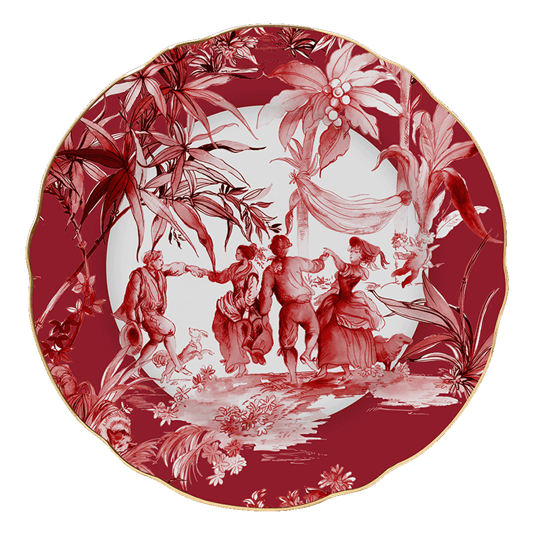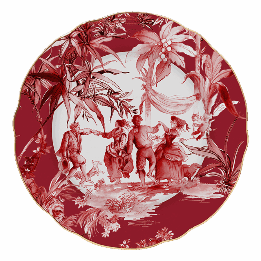 Descrição:Prato raso em porcelana, com estampa artística em vermelho retratando cena clássica entre folhagens. O acabamento em friso dourado na borda acrescenta sofisticação e requinte, tornando a peça ideal para compor mesas postas elegantes e cheias de estilo.