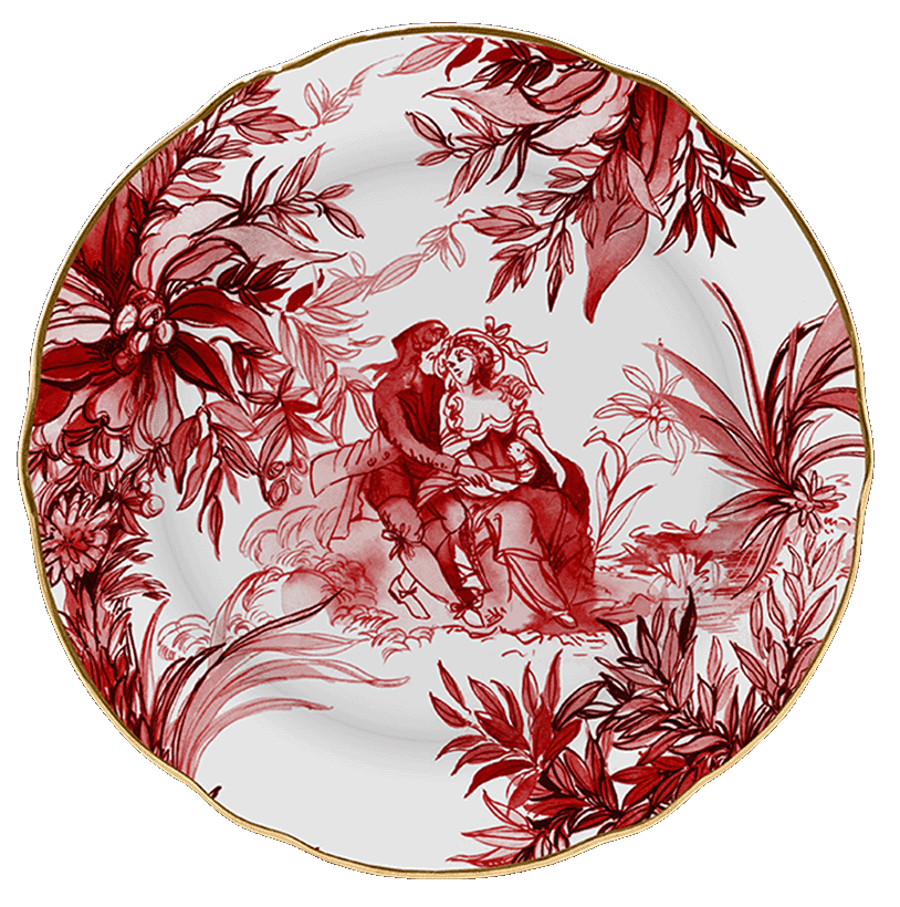 Descrição:Prato de sobremesa em porcelana italiana, com estampa artística em vermelho retratando cena clássica entre folhagens. O design é valorizado pelo acabamento em friso dourado na borda, que acrescenta requinte e sofisticação. Ideal para servir sobremesas com charme e compor mesas postas elegantes.