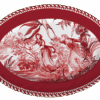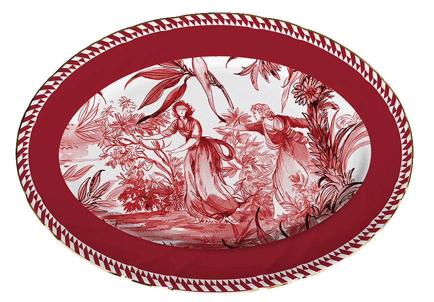 Descrição: Travessa oval em porcelana com estampa artística em vermelho, retratando cena clássica entre flores e folhagens. A borda em vermelho intenso é destacada por detalhe geométrico e acabamento em friso dourado, que acrescenta elegância e sofisticação. Uma peça versátil e requintada para servir com charme e compor mesas postas especiais.