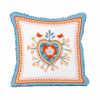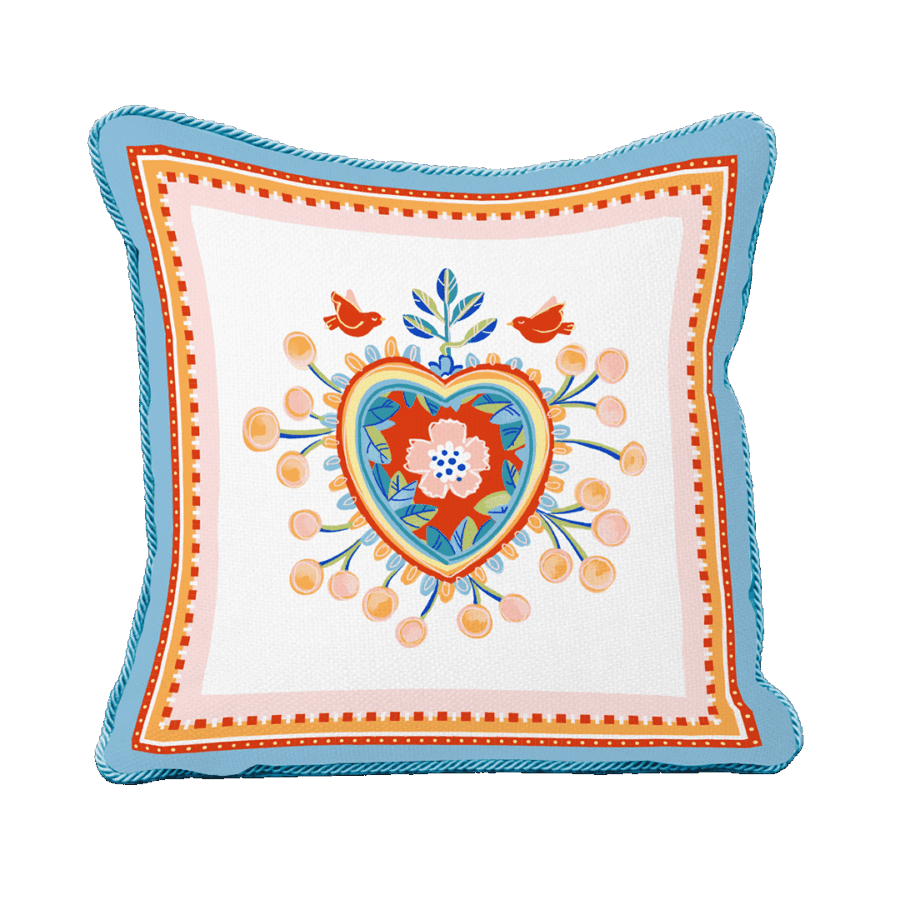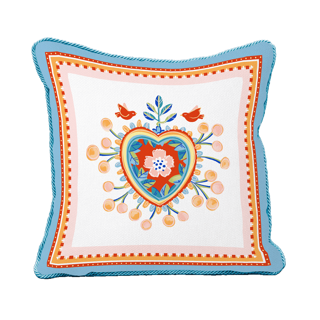 Descrição: Almofada quadrada com estampa central em formato de coração, decorada com flores e pássaros em tons de laranja, azul e rosa. Uma peça alegre e sofisticada, ideal para decorar sofás, poltronas ou camas, trazendo aconchego e estilo à decoração.