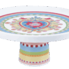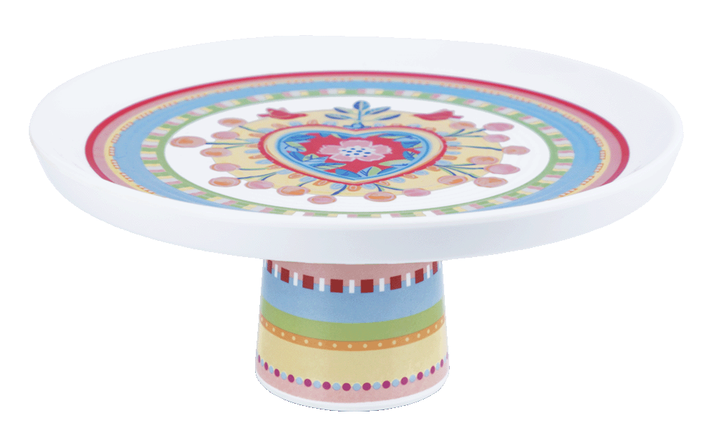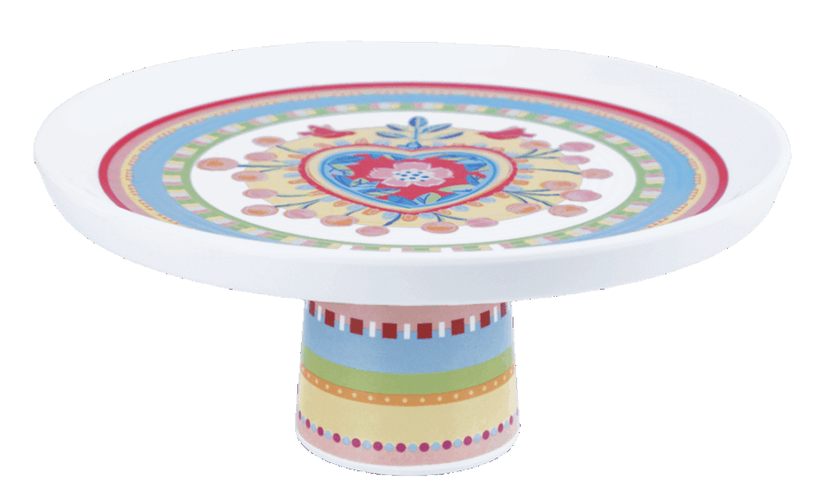 Descrição: Boleira em melamina branca com estampa central colorida em formato de coração rodeado por flores e pássaros. A base traz faixas decorativas em azul, verde, vermelho e dourado, criando um contraste alegre e sofisticado. Ideal para servir bolos, tortas e sobremesas, acrescenta charme e estilo às mesas postas.