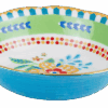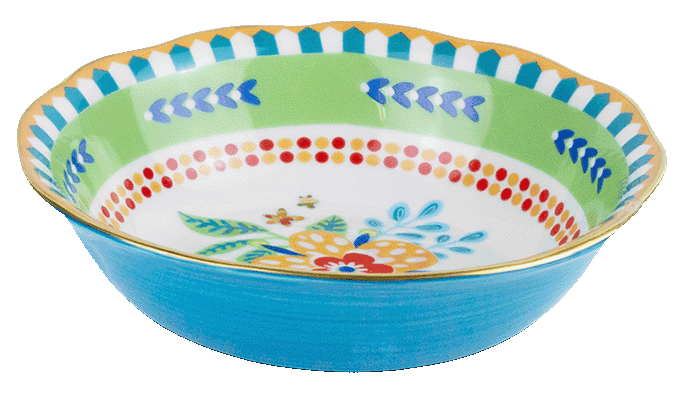 Descrição: Bowl para frutas em porcelana, com estampa floral central em cores vibrantes como amarelo, azul e vermelho. A peça é valorizada pela lateral em azul intenso, que contrasta com as bordas verdes e os detalhes geométricos coloridos. O acabamento em friso dourado na borda acrescenta requinte, tornando-o ideal para servir frutas ou sobremesas e compor mesas postas alegres e sofisticadas.