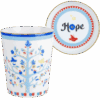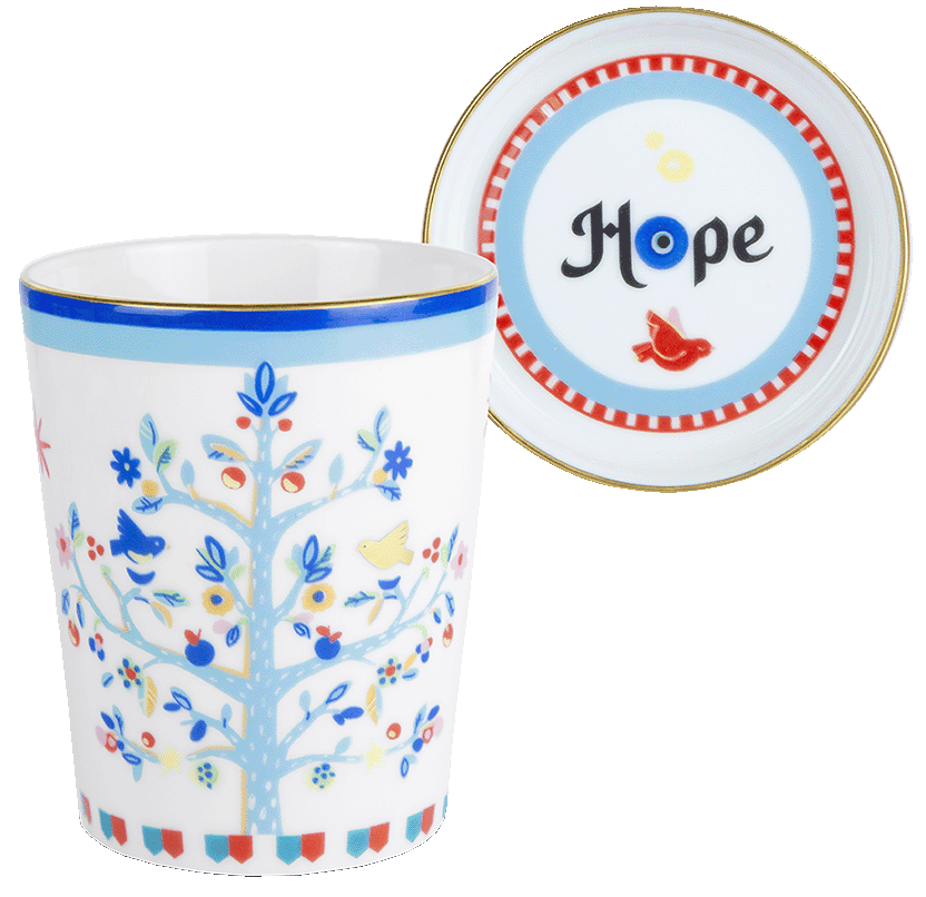 Descrição: Copo com pires em porcelana, decorado com estampa colorida de árvore florida e pássaros em tons de azul, vermelho e amarelo. O pires traz a palavra Hope no centro, rodeada por detalhes geométricos, ambos finalizados com friso dourado que acrescenta sofisticação. Um conjunto alegre e elegante, ideal para compor mesas postas cheias de charme.
