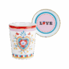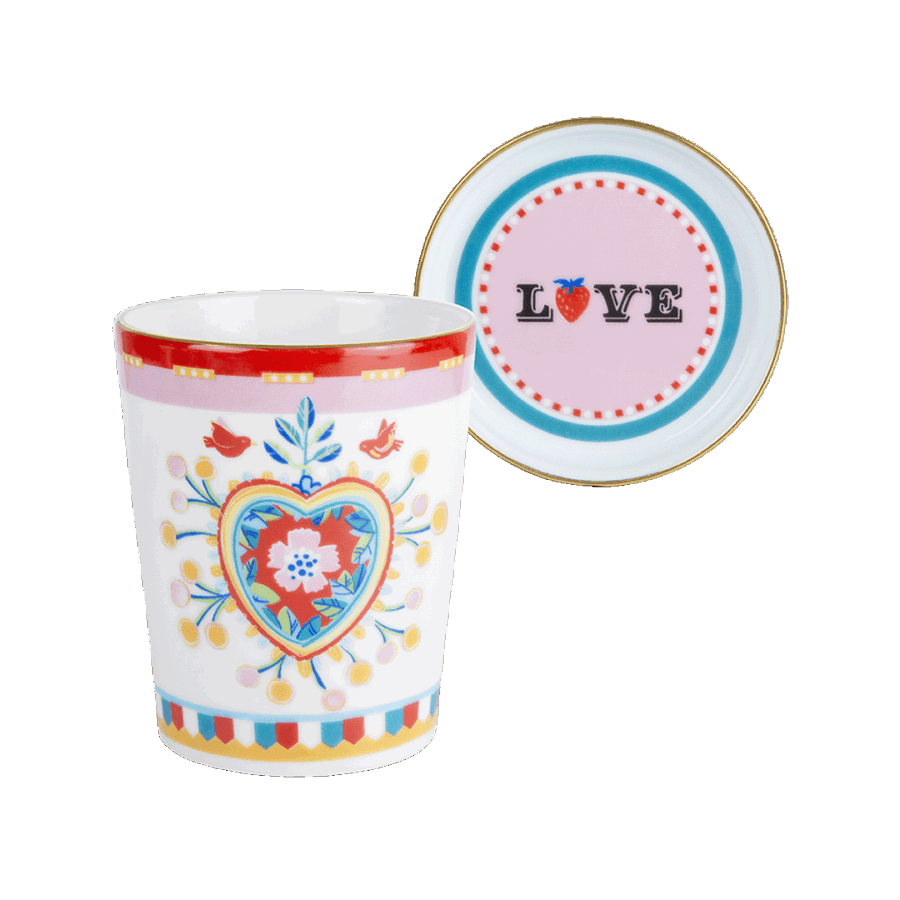 Descrição: Copo com pires em porcelana, decorado com estampa central em formato de coração floral em tons de vermelho, azul e amarelo. O pires apresenta a palavra LOVE em destaque sobre fundo rosa, ambos finalizados com friso dourado que acrescenta sofisticação. Um conjunto delicado e vibrante, perfeito para compor mesas postas modernas e cheias de charme.