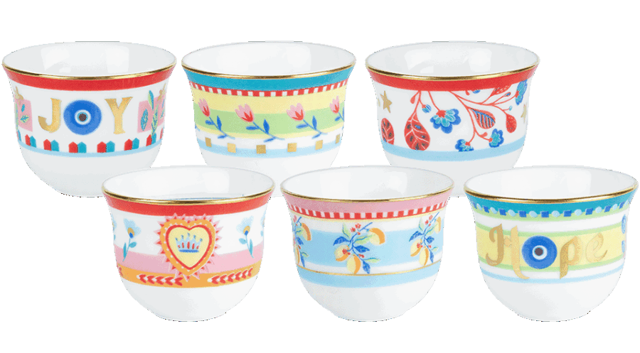 Descrição: Conjunto de copos de café árabe em porcelana, composto por peças com diferentes estampas coloridas que variam entre florais, geométricas e palavras inspiradoras como JOY e HOPE. Cada copo é finalizado com friso dourado na borda, acrescentando sofisticação ao design vibrante e alegre. Um conjunto exclusivo, ideal para servir café com charme e compor mesas postas cheias de personalidade.