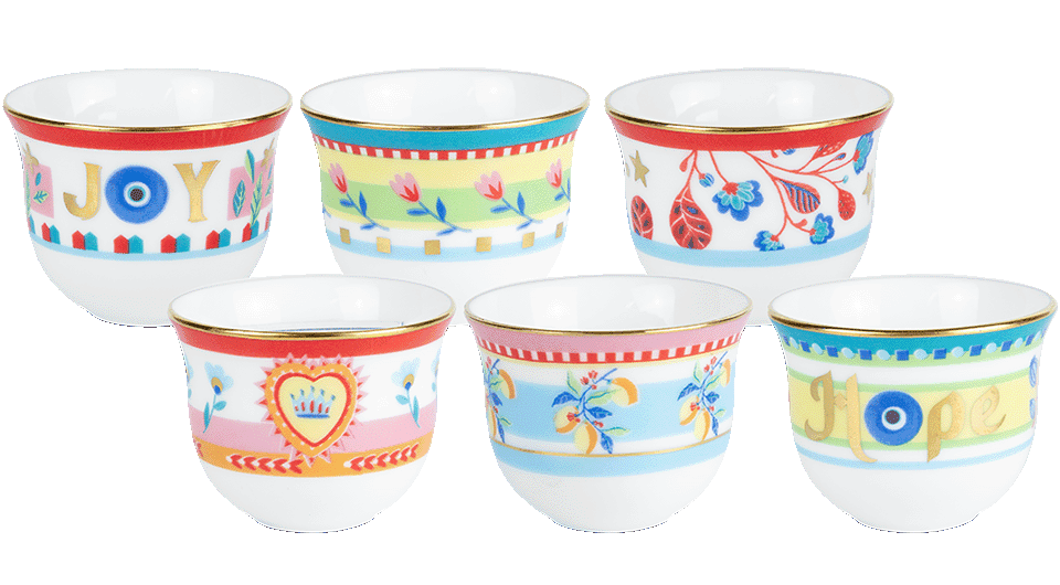 Descrição: Conjunto de copos de café árabe em porcelana, composto por peças com diferentes estampas coloridas que variam entre florais, geométricas e palavras inspiradoras como JOY e HOPE. Cada copo é finalizado com friso dourado na borda, acrescentando sofisticação ao design vibrante e alegre. Um conjunto exclusivo, ideal para servir café com charme e compor mesas postas cheias de personalidade.