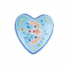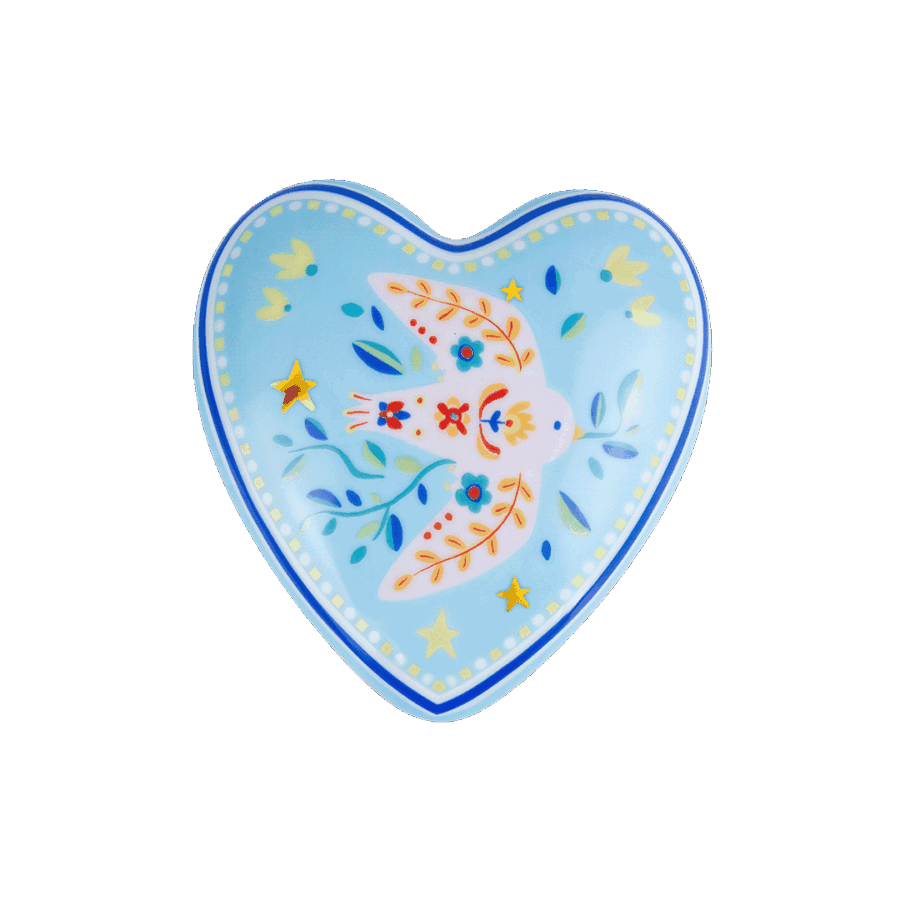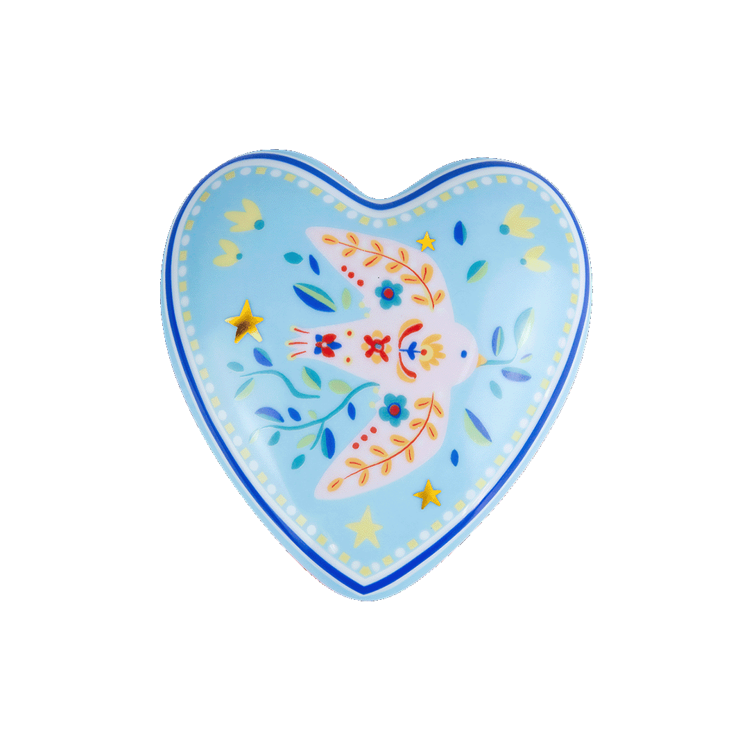 Descrição: Coração grande em porcelana com fundo azul claro e estampa de ave estilizada em tons de laranja, vermelho e azul, cercada por pequenos detalhes florais e estrelas. O contorno delicado em azul é finalizado com friso dourado, que acrescenta elegância ao design. Uma peça charmosa e versátil, ideal para decorar ou servir pequenas porções com sofisticação.