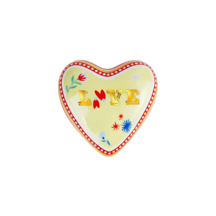Descrição: Coração pequeno em porcelana com fundo amarelo suave e a palavra LOVE em destaque no centro, acompanhada por delicados detalhes florais coloridos. O contorno recebe acabamento em vermelho e é finalizado com friso dourado, que acrescenta requinte. Uma peça delicada e charmosa, ideal para decorar ou servir pequenas porções com elegância.