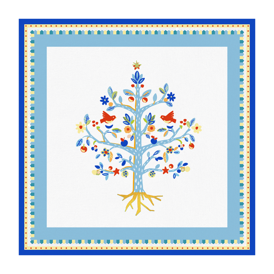 Descrição: Jogo americano em algodão, com estampa central de árvore florida acompanhada por pássaros e flores em tons vibrantes de azul, vermelho e amarelo. A borda azul com detalhes geométricos coloridos valoriza o design e acrescenta harmonia. Uma peça charmosa e elegante, ideal para compor mesas postas e também para tornar momentos especiais ainda mais sofisticados.