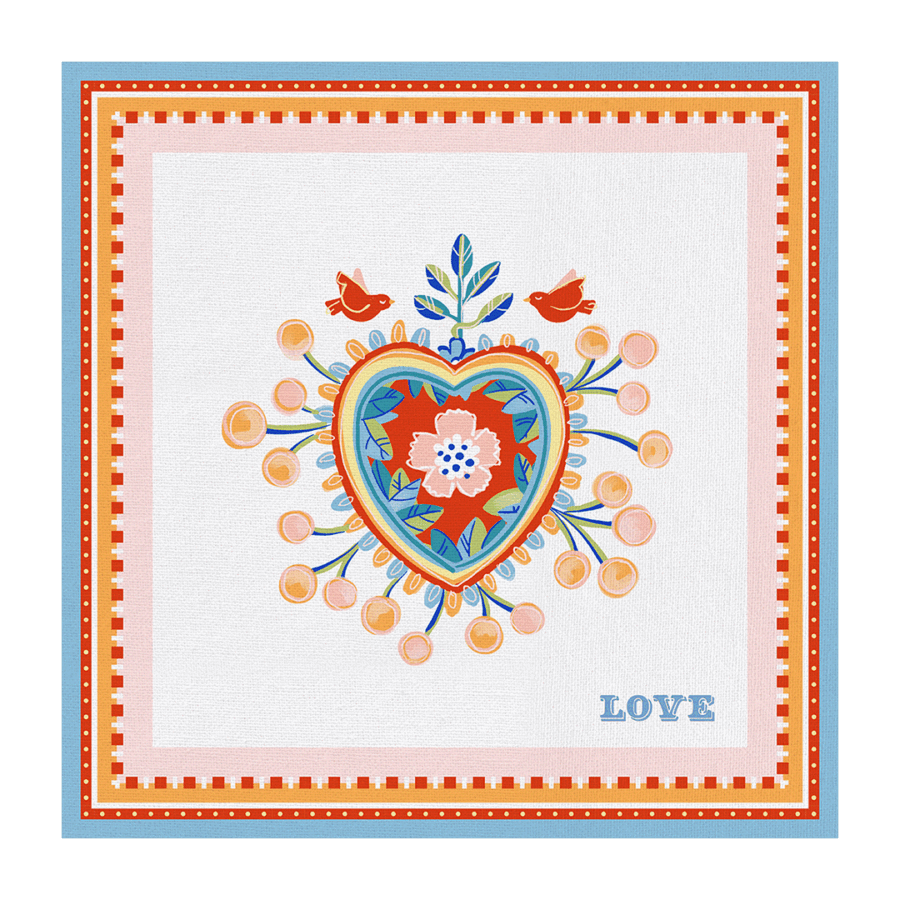 Descrição: Jogo americano em algodão, com estampa central em forma de coração floral em tons de azul, vermelho e laranja, acompanhado por delicados pássaros e pela palavra LOVE em destaque. A borda colorida traz equilíbrio e vivacidade ao design. Uma peça sofisticada e alegre, perfeita para valorizar a mesa posta e também para compor momentos especiais com charme e estilo.