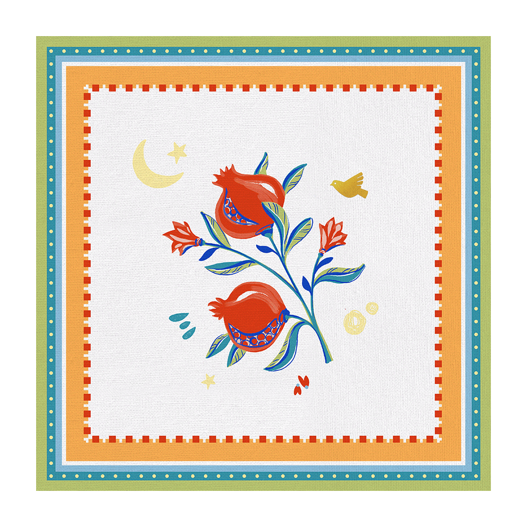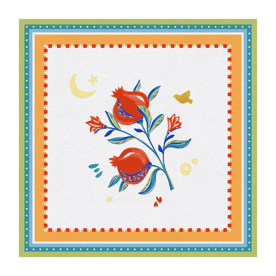 Descrição: Jogo americano em algodão, com estampa central de romãs em tons de vermelho e azul, acompanhadas por delicados detalhes de estrelas, lua e pássaro dourado. A borda laranja com acabamento geométrico colorido traz vivacidade e equilíbrio ao design. Uma peça sofisticada e alegre, perfeita para compor mesas postas e para tornar momentos especiais ainda mais marcantes.