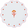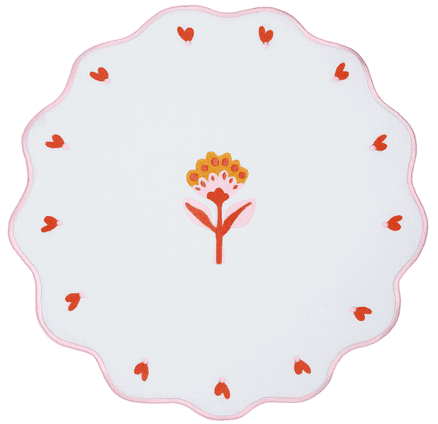 Descrição: Jogo americano redondo em algodão, com borda ondulada em rosa claro e pequenos corações vermelhos distribuídos ao redor. No centro, uma delicada flor em vermelho e amarelo acrescenta charme e frescor ao design. Uma peça romântica e sofisticada, perfeita para compor mesas postas e realçar momentos especiais com elegância e estilo.