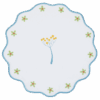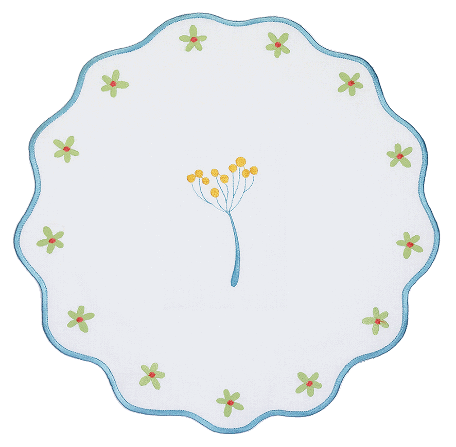 Descrição: Jogo americano redondo em algodão, com borda ondulada em azul e delicadas flores verdes com miolo amarelo distribuídas ao redor. No centro, um ramo simples em azul e amarelo adiciona leveza e frescor ao design. Uma peça charmosa e delicada, ideal para compor mesas postas e destacar momentos especiais com sofisticação e alegria.