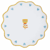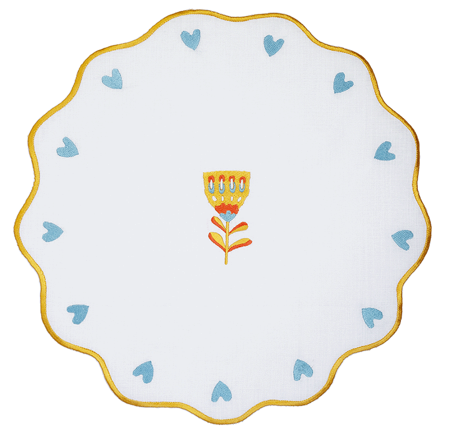 Descrição: Jogo americano redondo em algodão, com borda ondulada em amarelo e delicados corações azuis distribuídos ao redor. No centro, uma flor estilizada em tons de amarelo, vermelho e azul acrescenta charme ao design. Uma peça elegante e alegre, perfeita para compor mesas postas e transformar momentos especiais em ocasiões inesquecíveis.