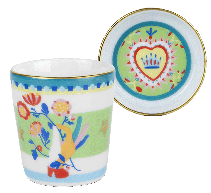 Descrição: Mini copo em porcelana com estampa colorida de flores e pássaro estilizado em tons vivos de azul, vermelho e amarelo, em contraste com fundo verde e branco. Acompanha pires em verde com coração central coroado e acabamento em friso dourado. Um conjunto cheio de charme e personalidade, perfeito para compor mesas postas e transformar momentos especiais em celebrações elegantes.