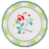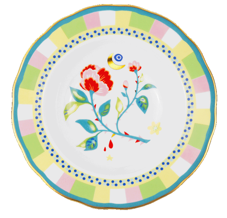 Descrição: Prato fundo em porcelana , com estampa central de delicadas flores vermelhas e folhas em tons de azul e verde, acompanhadas de pequenos detalhes como lua e estrela. A borda colorida em verde, rosa e amarelo com frisos geométricos adiciona um toque alegre e moderno. Uma peça versátil e charmosa, perfeita para compor mesas postas cheias de estilo.
