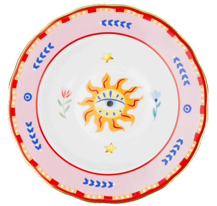 Descrição: Prato fundo em porcelana, com estampa central do sol em tons de amarelo e laranja, cercado por delicados detalhes florais. A borda rosa com acabamento em vermelho e desenhos geométricos acrescenta vivacidade e estilo único. Uma peça sofisticada e alegre, ideal para compor mesas postas cheias de personalidade.