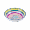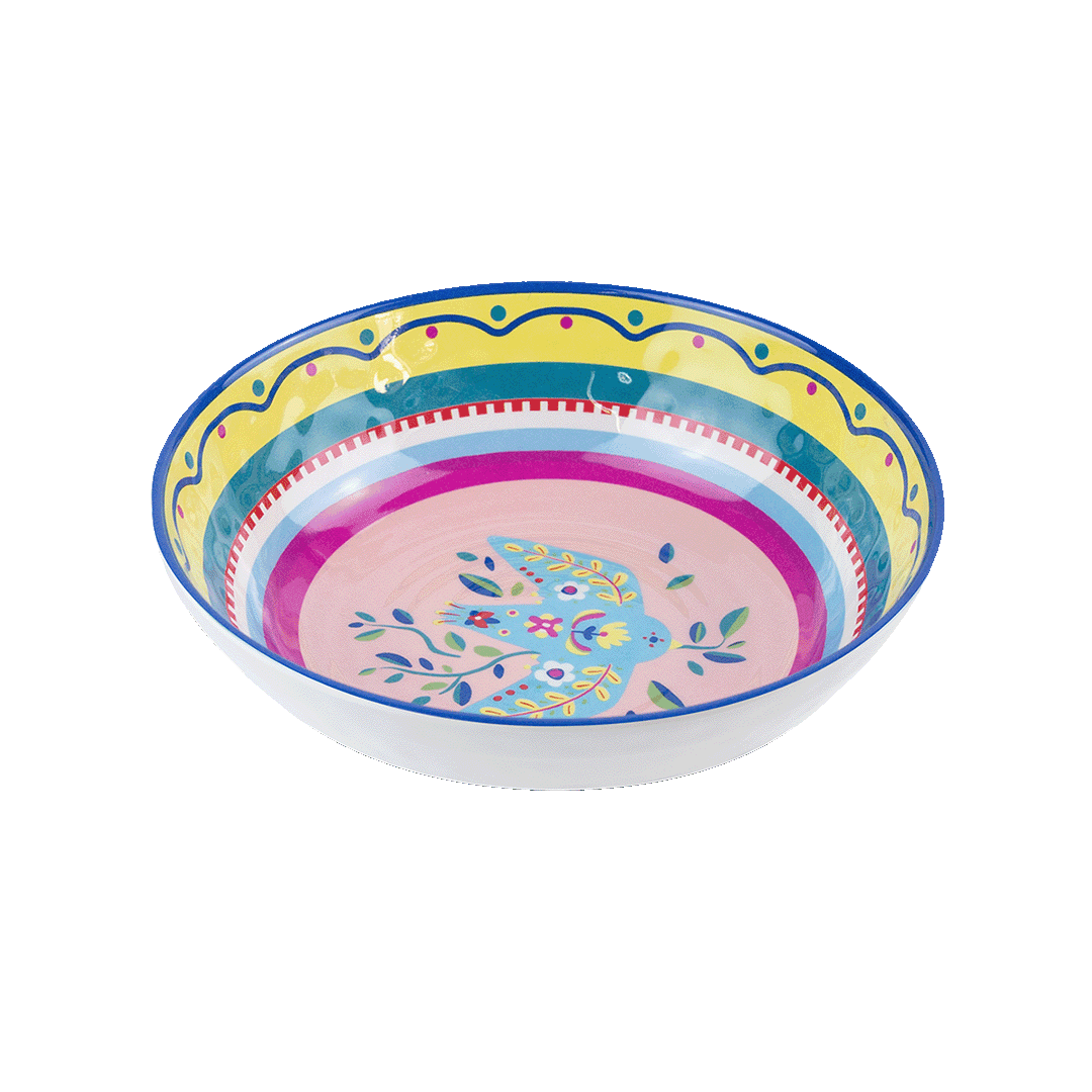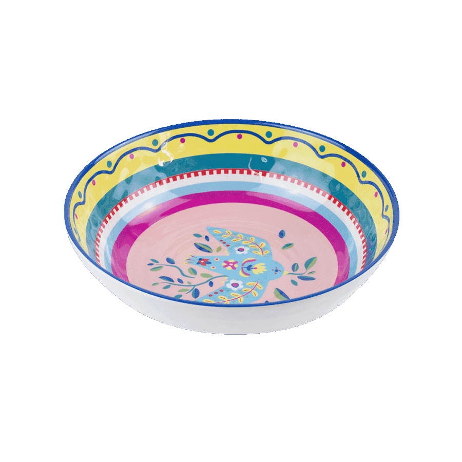 Descrição: Prato fundo em melamina, decorado com estampa de pomba no centro em fundo rosa, rodeado por detalhes coloridos em amarelo, verde e azul que criam um visual vibrante e moderno. Perfeito para trazer charme e descontração à mesa posta, unindo praticidade e estilo.