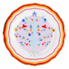 Descrição: Prato de pão em porcelana, decorado com um delicado desenho central de árvore da vida em tons vibrantes de azul, vermelho e amarelo. Sua borda ondulada em vermelho e dourado traz sofisticação e destaque à peça, tornando-a perfeita para compor mesas postas cheias de charme e personalidade.