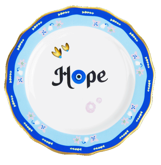 Descrição: Prato de pão em porcelana, com design central em lettering “Hope” acompanhado de delicados símbolos e detalhes dourados. A borda azul intensa com friso dourado traz sofisticação e modernidade, tornando a peça ideal para complementar mesas postas elegantes e cheias de personalidade.