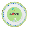Descrição: Prato de pão em porcelana, com fundo verde vibrante e estampa central em lettering “LOVE” em contraste delicado com flores e borboleta. A borda é finalizada com friso dourado e detalhes em azul, que trazem elegância e sofisticação à peça.