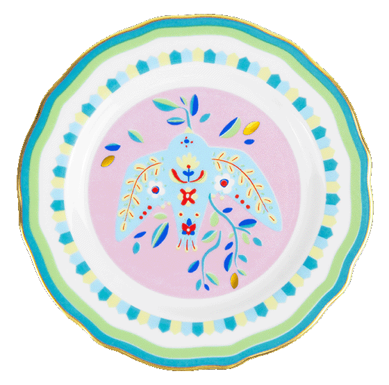 Descrição: Prato de pão em porcelana, com estampa central de uma pomba em tons coloridos sobre fundo lilás suave. A borda em verde e azul traz frescor e é finalizada com friso dourado, que adiciona um toque de sofisticação.