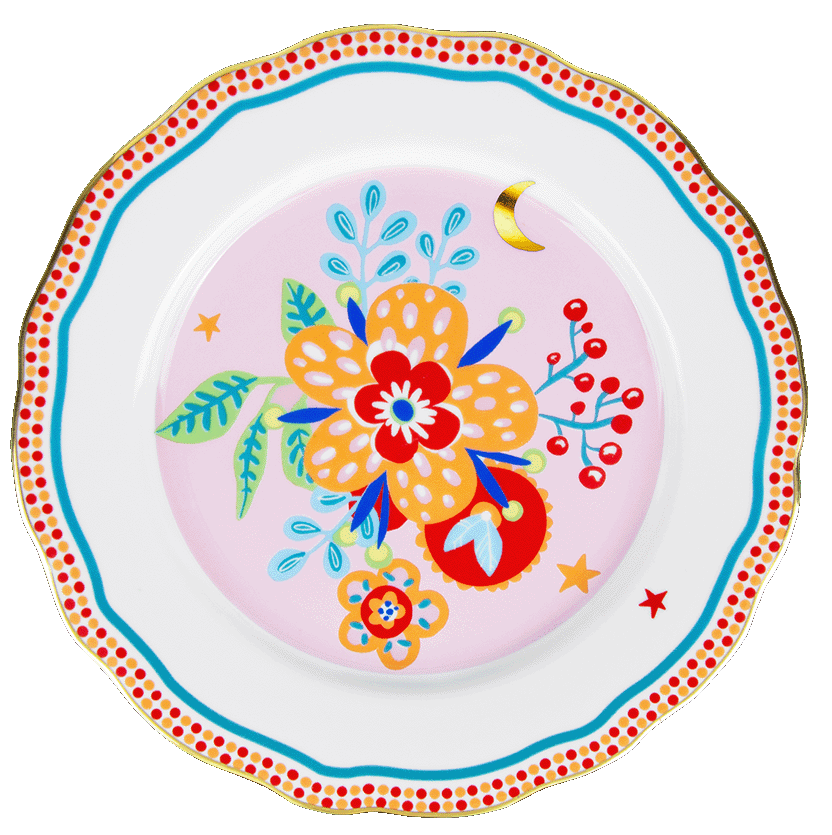 Descrição: Prato raso em porcelana, com fundo rosa claro decorado por um grande arranjo floral central em tons de amarelo, vermelho, azul e verde, acompanhado de pequenos detalhes como lua e estrelas. A borda possui acabamento ondulado, em vermelho com padrões geométricos e detalhe azul delicado no contorno. Uma peça vibrante e charmosa, ideal para compor uma mesa posta cheia de personalidade.
